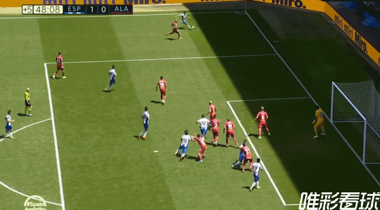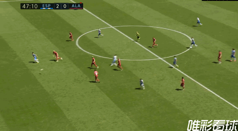 易边再战,第47分钟,中圈弧附近恩巴尔巴得球直塞身后球给前场,武磊突进获得单刀球突入禁区,面对门将轻松推射破门,西班牙人2-0领先。