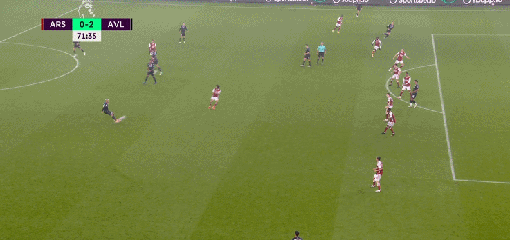 第72分钟,中圈前沿维拉长传冲吊,左侧底线巴克利不停球横敲,沃特金斯冲顶破门!维拉2-0阿森纳!