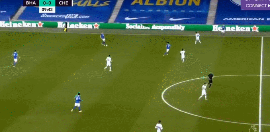 赛季初期对阵布莱顿,哈弗茨被安置在了4-3-3的右中场这个位置上,这也是兰帕德对哈弗茨的第一段的尝试。哈弗茨在中场能够提供的东西是什么?在还未适应对抗的情况下,可以在中场为球队提供攻守转换阶段的过渡传递,同时也可以利用自己的灵活性稍微配合当时拖后的若日尼奥/坎特/科瓦西奇。