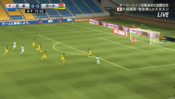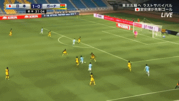 16分钟时,日本队首开纪录。凭借个人能力,久保建英在禁区右侧强行晃开空间后左脚大力低射。加纳门将虽然将球扑出,但仍然被堂安律补射破门。在禁区左侧,堂安律左脚凌空抽射破门。在本赛季中,堂安律效力于德甲比勒菲尔德,他以绝对主力身份帮助球队保级。