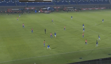 第33分钟,内马尔前场带球突破被犯规撞倒,随后内马尔主罚任意球射门打偏。第43分钟,内马尔左路过人后传中,巴拉圭将球解围出禁区。第43分钟,弗雷德犯规吃到黄牌。补时第2分钟,内马尔挑传,理查利森射门得分,但被判越位进球无效。上半场结束,巴西暂时1-0领先巴拉圭。