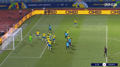 第37分钟,埃弗顿开出右侧任意球,米利唐高高跳起后头球破门,巴西1-0!