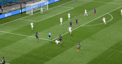 本场比赛,法国队依然是豪华攻击线出击,姆巴佩、格里兹曼和本泽马携手出击,而此前法国队已经面对瑞士队连续7场不败。开场之后,第15分钟,祖贝尔左路精准传中,塞费罗维奇中路高高跃起,力压朗格莱,头球冲顶,皮球飞入球门左下角,0-1!第22分钟,拉比奥特左路杀入禁区,底线附近传中,索默拦截没有碰到皮球,但后点的本泽马慢了半拍,错失空门机会。