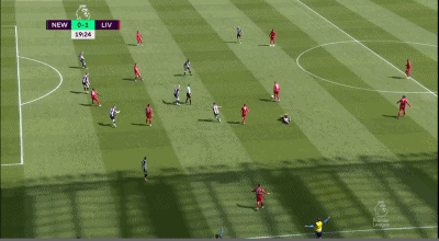 第19分钟,米尔纳中场铲出舍尔的脚下球,舍尔倒地,裁判没有吹停比赛,利物浦继续进攻。凯塔带球向前,右侧禁区角上横敲若塔,若塔直塞回做,凯塔前插,拿球后横切两步,趟过杜布拉夫卡后把球推进空门,利物浦1-0。
