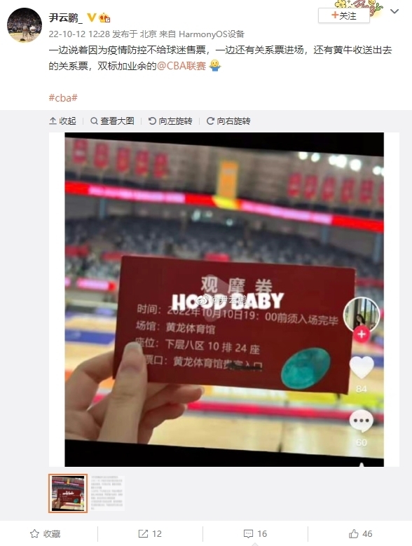 nba直播讯 体育博主尹云鹏爆料,CBA存在售票双标情况,一边说着因为疫情防控不给球迷售票,一边还有关系票进场,还有黄牛收送出去的关系票。