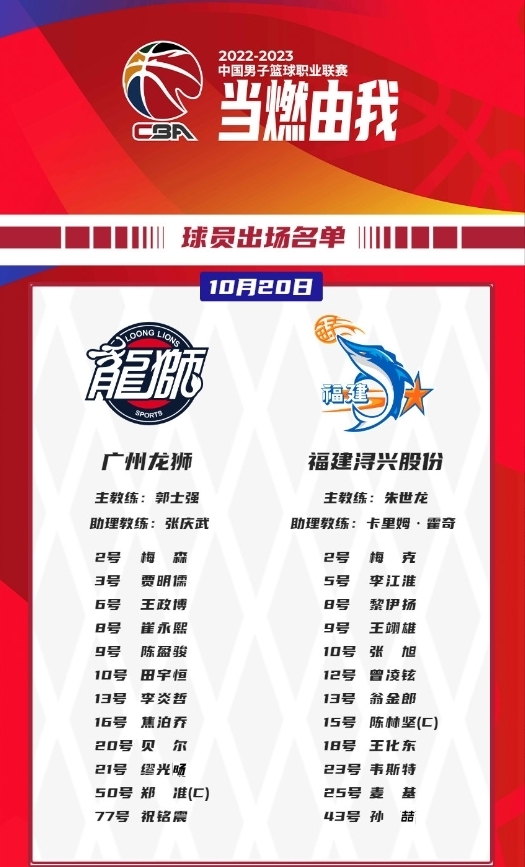nba直播讯 CBA常规赛,广州对阵福建的大名单已经出炉。