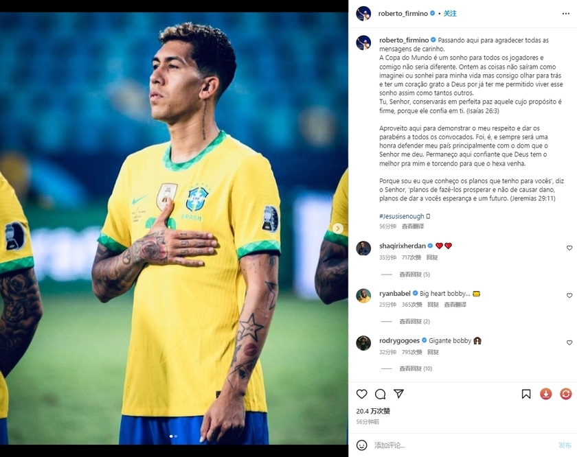 nba直播讯 此前落选世界杯巴西名单,今日,菲尔米诺社交媒体发声:世界杯是每个球员的梦想,过去现在将来,保卫我的国家永远是一种荣誉。