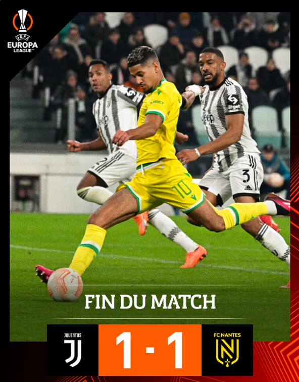 全场比赛结束,尤文在主场与南特踢成1-1平局。