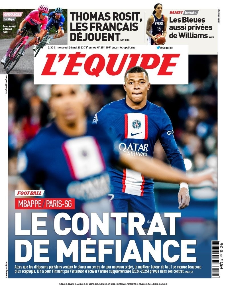 队报表示,尽管巴黎高层希望围绕姆巴佩建队,但姆巴佩对此持怀疑态度,目前他不打算激活续约选项(续约至2025年),下决定的期限是2023年7月31日。