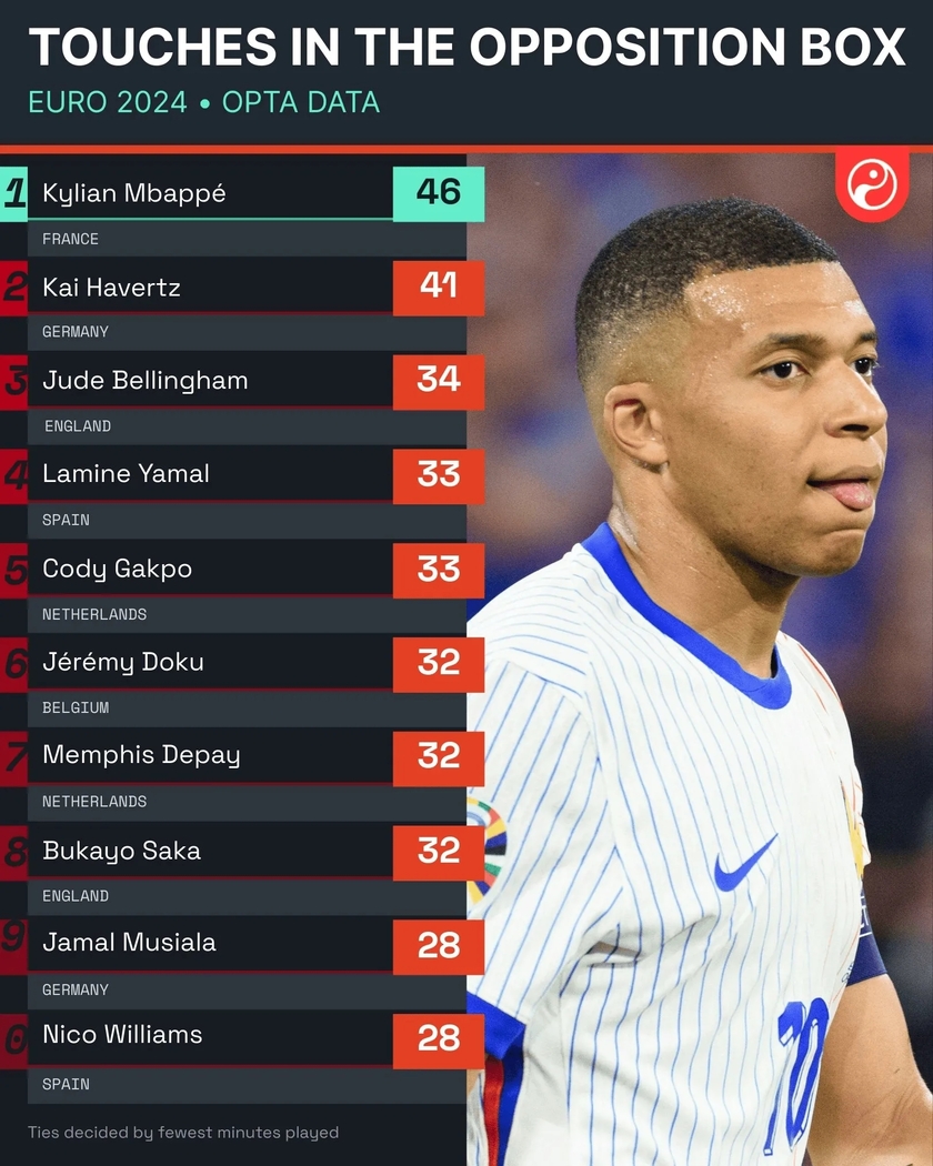 Squawka统计了本届欧洲杯在禁区内触球次数的球员排名,具体如下:
