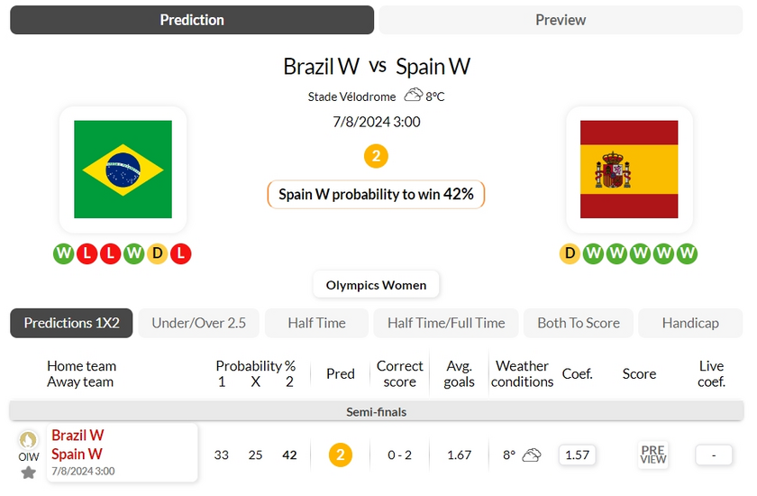 Brazil W have won just 1 of their last 7 home matches in Olympics Women