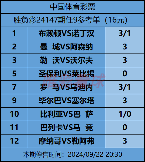 金石开:本期周日彩好戏连台,英超有曼城VS阿森纳的焦点大战,意甲则有米兰德比重磅来袭。我们还是先来说说英超场次,本期英超有布赖顿、曼城这两大主场胆材,布赖顿在新赛季起步就很抢眼,主场2比1力克曼联、客场1比1逼平阿森纳。不过上轮他们主场被升班马伊普斯维奇爆冷逼平,遭遇两连平。虽然目前仍2胜2平保持不败,但诺丁汉森林目前同样如此,也是2胜2平在赛季开始后还没有输过。特别是上轮诺丁汉客场1比0力克利物浦,爆出英超开赛以来的一大冷门。那么,本轮两支不败球队相遇,布赖顿能否在主场顺利拿下对手?