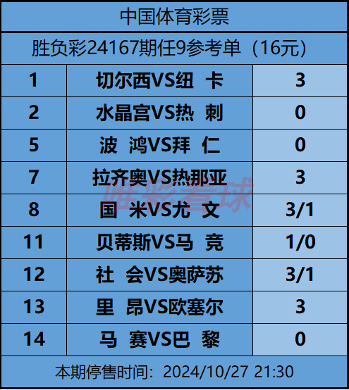 姜山:本周的欧联杯胜负彩中我们也提到,热刺大概率会采取大轮换。结果索兰克、孙兴慜、约翰逊、库鲁塞夫斯基、比苏马、范德文、罗梅罗、波罗、维卡里奥等上轮联赛首发的主力都得到轮休的机会,孙兴慜甚至没有进入比赛名单。只有左后卫乌多基和中场麦迪逊继续作为主力登场,热刺也用最小的代价1比0击败阿尔克马尔,延续欧联杯全胜战绩。再加上周中欧战是主场作战,所以热刺消耗不大,这和上一场欧联杯做客匈牙利之后回到联赛输给布赖顿的情况多少还是有些不同。孙兴慜由于上轮联赛复出后再次受伤,本轮大概率也会缺席与水晶宫的比赛,不过此前他缺席的情况下,热刺战绩没有受到太大影响,联赛客场3比0击败曼联、欧联杯客场2比1力克费伦茨瓦罗斯都是在缺少孙兴慜的情况下取得的胜利。维尔纳本轮有机会作为首发左边锋登场。水晶宫的情况我们此前已经介绍过多次,本赛季受到多名主力离队的影响,这支上赛季打出“黑旋风”式进攻的球队一蹶不振,奥利塞、阿尤、爱德华多、安德森等主力的离队让该队在攻防两端都受到极大的影响,新加盟的恩凯蒂亚、镰田大地等人发挥平平,进攻端还是只能依靠旧将马特塔、埃泽。再加上利亚德、理查德斯这两名中卫的受伤,以及后腰杜库雷的长期伤缺,水晶宫本赛季已经成了降级热门。最近3轮他们连续不敌埃弗顿、利物浦和诺丁汉森林,主帅格拉斯纳的帅位摇摇欲坠,英国媒体已经在炒作索斯盖特、莫耶斯、波特等人可能会入主水晶宫的新闻。本轮如果主场输给热刺,格拉斯纳下课的可能性会大增。而热刺本身也是水晶宫的苦主,过去5次联赛交手他们对水晶宫全胜,最近两个赛季,水晶宫都在主场不敌热刺,其中2022/2023赛季更是主场0比4惨败。所以尽管孙兴慜会再次缺阵,但以水晶宫目前的状况,恐怕很难在热刺身上抢到分数。