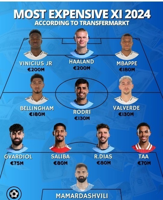 参考德转的最新数据,当今世界足坛,各个位置身价最高的球员,哈兰德和威尼修斯都是2亿欧元。