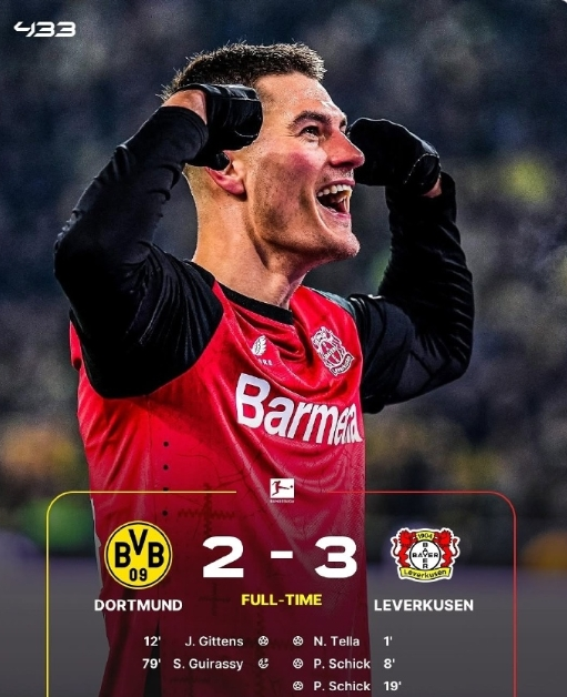 第19分钟,勒沃库森反击机会,扎卡推进给到右路弗林蓬,后者带球观察后传中,门前包抄的希克再次完成抢点得分,多特主场1-3落后。第77分钟,塔普索巴禁区内争抢卡位时手臂击打到杜兰维尔面部,后者痛苦倒地,VAR介入后主裁亲自观看回放决定判罚点球,吉拉西主罚命中,比分改写为2-3。最终多特2-3勒沃库森。积分榜方面,勒沃库森先赛距榜首拜仁1分,多特25分第六。