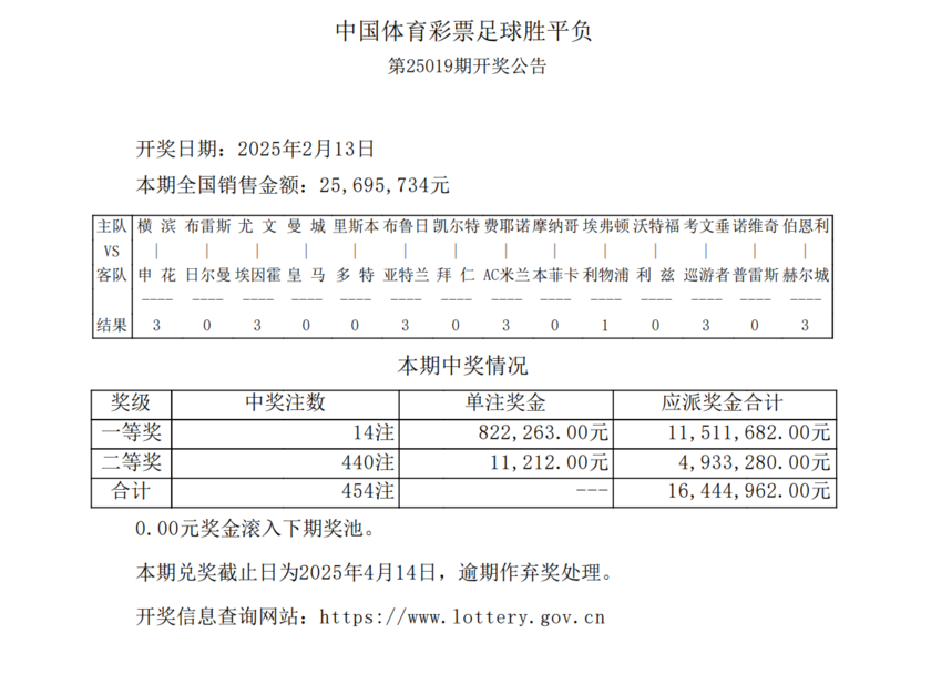 nba直播讯 北京时间2月13日,胜负彩第25019期开奖结果揭晓。本期胜负彩一等奖开出14注,单注奖金822,263元;二等奖开出440注,单注奖金11,212元;任九玩法则开出4075注,单注奖金3268元