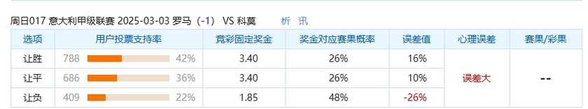 本场比赛中,选罗马让球负的球迷偏少了,只有22%的球迷选择让球负选项,这场比赛中,大家都看罗马主场会赢得这场比赛并且可能大胜这次比赛,不看好科莫能客场保住数据,但是与奖金对应赛果概率的48%相差26%,数据误差较大。