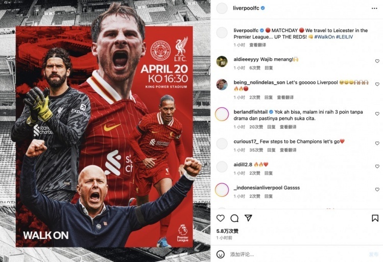 nba直播讯 北京时间4月20日晚上11点30分,英超第33轮,利物浦即将客场挑战莱斯特城,只要赢球和阿森纳输球,利物浦即可提前夺冠,赛前,利物浦通过社交媒体发布了此役制作的海报:“比赛日,我们将兵发莱斯特城,红军冲呀”