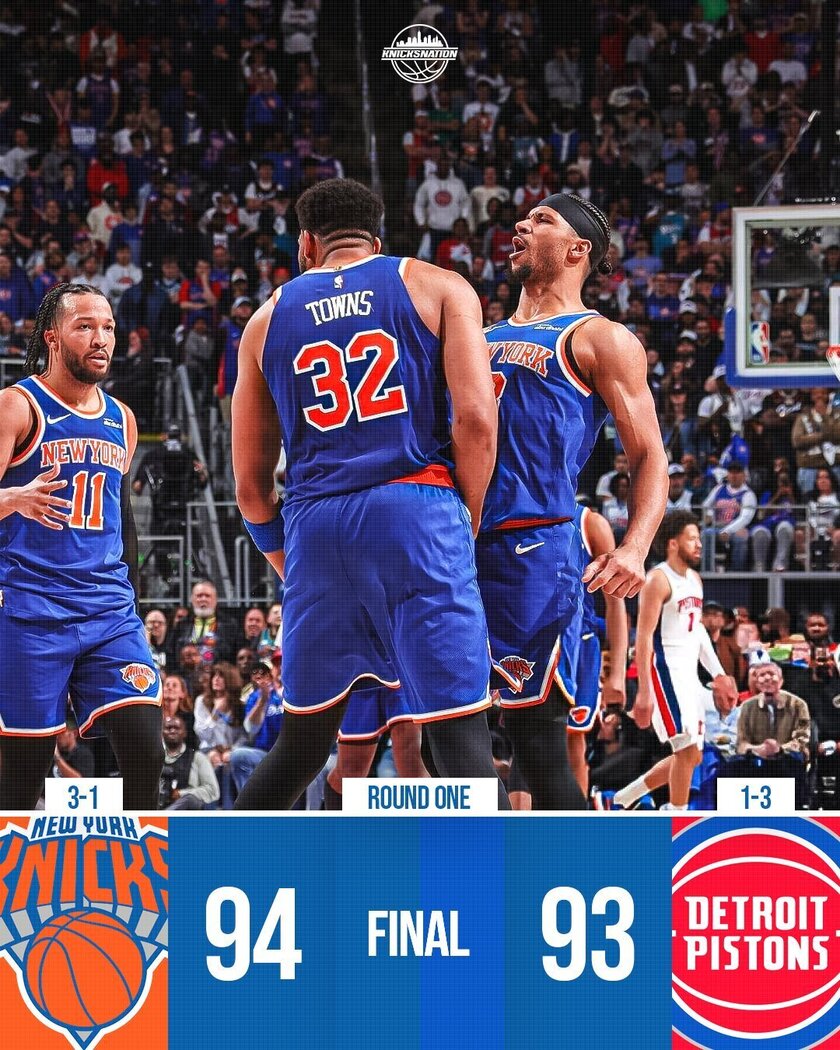 易边再战,唐斯上来就4犯,活塞顺势轰出12-2的攻击波反超比分。哈特、唐斯和布伦森连续命中3记三分止血,但康宁汉姆连续突破强势回应。布伦森受伤回更衣室,活塞再轰12-3的攻击波,领先到7分。末节,布伦森回归并连续突破追分,随后三分一度助尼克斯追平比分。施罗德和康宁汉姆连续中投稳住局势,唐斯连砍8分反超1分。关键时刻,康宁汉姆出现失误,绝杀中投也不进,小哈达威最后一投绝杀三分再丢。最终,尼克斯以94-93险胜活塞,大比分3-1夺得赛点。