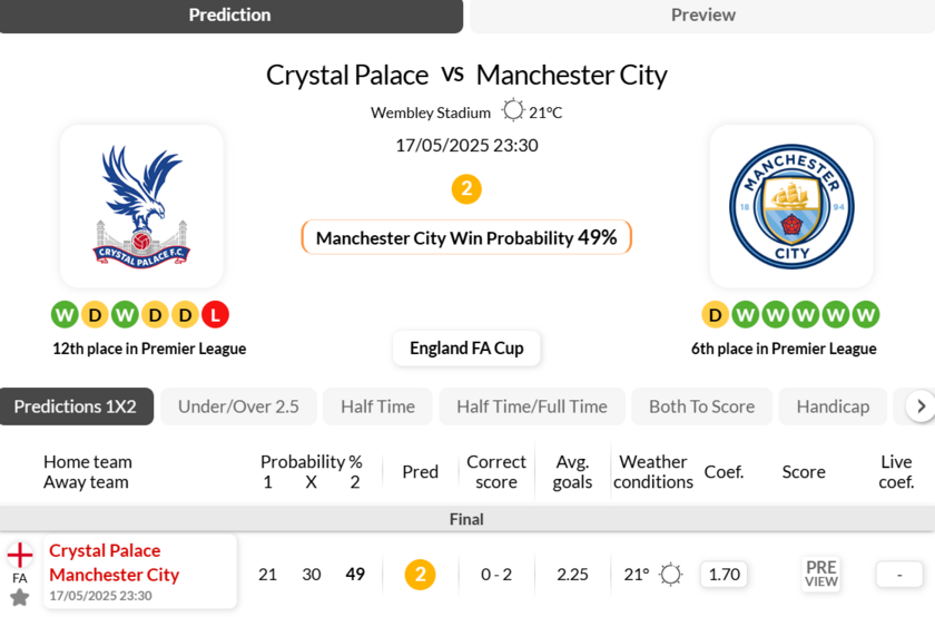 - Crystal Palace have been conceding 0.33 goals on average in their home games (FA Cup).