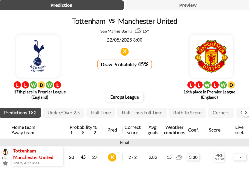 - In Manchester United's 5 most recent Europa League matches, there have been over 2.5 goals scored.