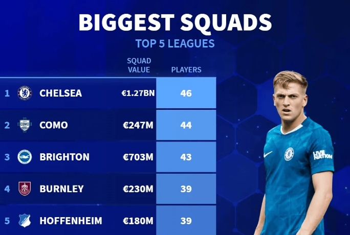各支球队正在进行转会操作。德转发布了一项榜单,内容为五大联赛各支球队目前的一线队人数排行榜。