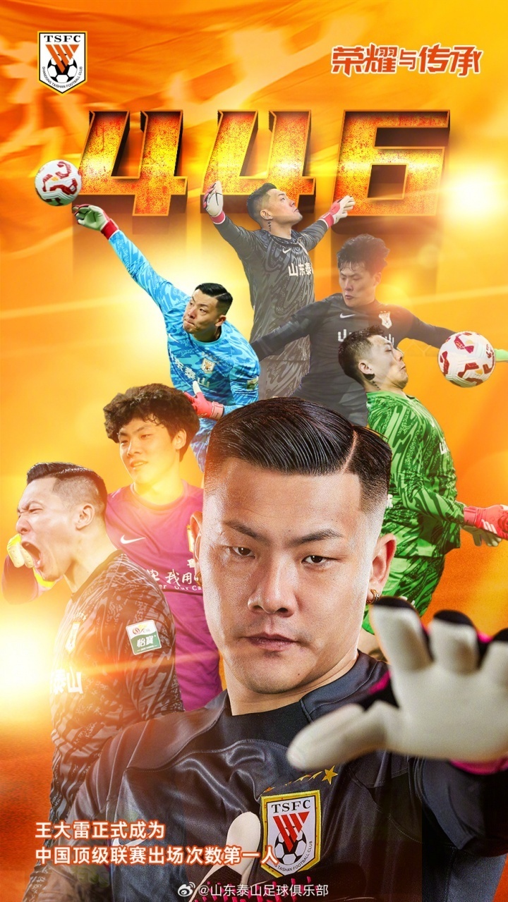 nba直播讯 北京时间7月28日,山东泰山官方发布海报,祝贺王大雷以446次出场超越汪嵩,正式成为中国顶级联赛出场次数第一人!