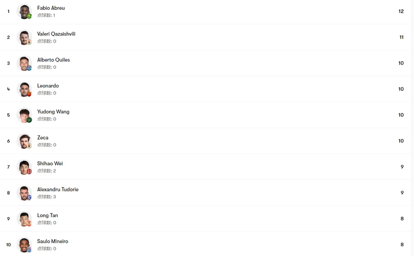 nba直播讯 北京时间7月30日,中超联赛截止第18轮射手榜,法比奥12球居首,刚刚上演帽子戏法的卡扎11球升至第二,王钰栋10球并列第三,韦世豪、谭龙在榜。