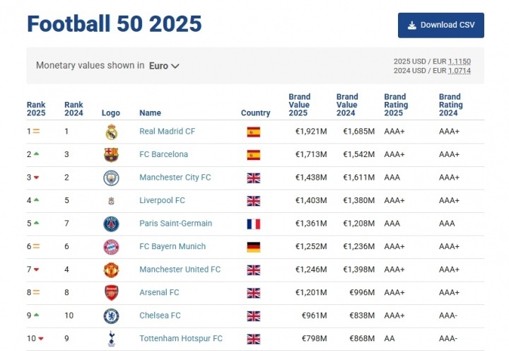nba直播讯 北京时间8月14日,品牌评估机构Brand Finance公布了2025年全球最具价值足球品牌,皇马以19.21亿欧蝉联榜首,巴萨17.13亿欧位居次席,曼城 14.38亿欧第3,拜仁 12.52亿欧第6。