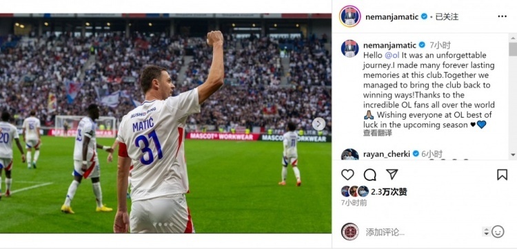 马蒂奇社媒写道:“大家好,里昂球迷们。这是一段难忘的旅程!我在这家俱乐部留下了许多永恒的回忆。