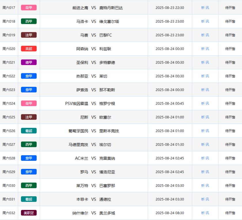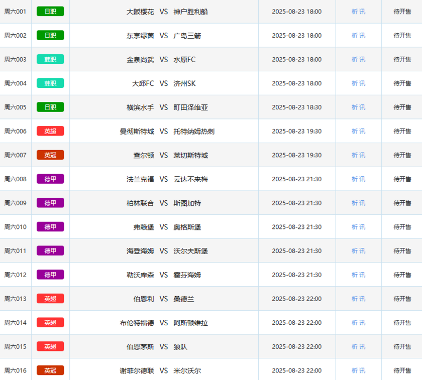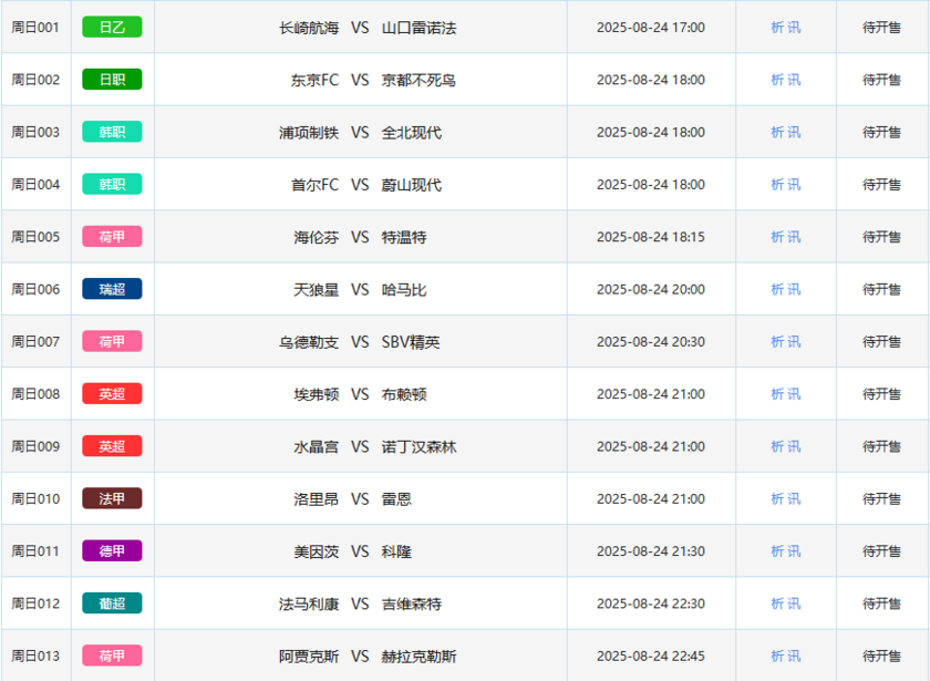 北京时间8月22日,本周五竞彩开售10场比赛,包括1场日职、1场芬超、1场德乙、1场挪超、1场荷乙、1场德甲、1场法甲、1场英超、1场英冠、1场西甲。本周六竞彩开售32场,涵盖3场日职、2场韩职、5场英超、2场英冠、6场德甲、2场荷甲、3场西甲、2场法甲、4场意甲、2场葡超和1场美职联。周日竞彩开售26场,包括1场日职、1场日乙、2场韩职、3场荷甲、1场瑞超、3场英超、3场法甲、2场德甲、2场葡超、4场西甲和4场意甲。下周一竞彩开售10场,共有2场意甲、1场法乙、1场挪超、1场英超、2场西甲、1场芬超、1场葡超和1场瑞超。