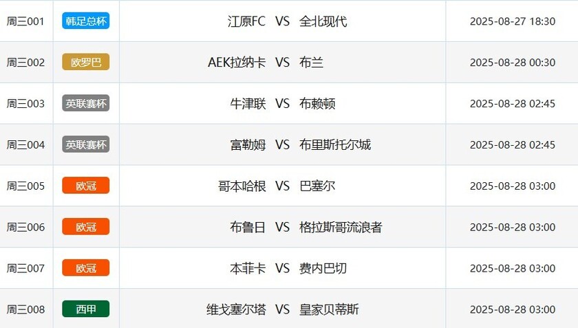 2️⃣周三(8月27日)待开售场次有8场,包括1场韩足总杯比赛第二回合,1场欧罗巴附加赛,2场英联杯比赛,3场欧冠比赛和1场西甲比赛。