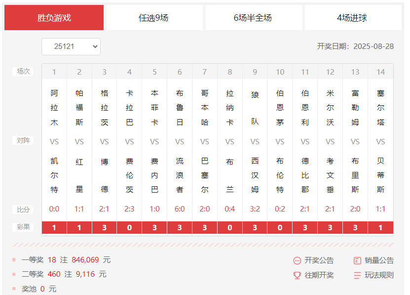 nba直播讯 北京时间8月28日,胜负彩第25121期开奖结果揭晓。
