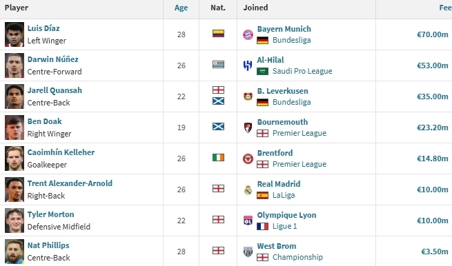 2. 努涅斯:转会至利雅得新月,转会费5300万欧。