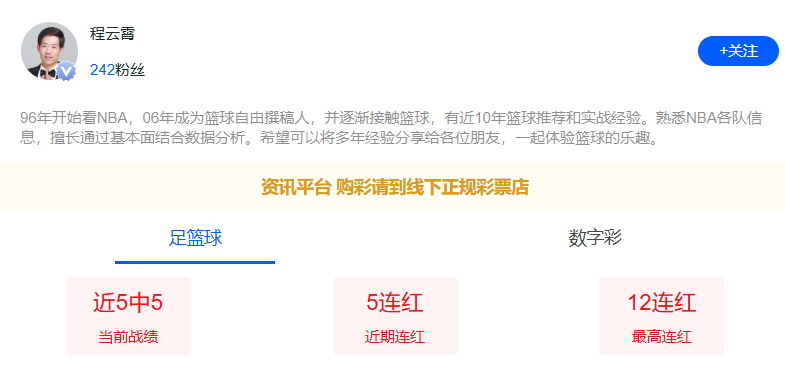 程云霄五连红!更多篮球信心场次推荐点点关注不迷路!