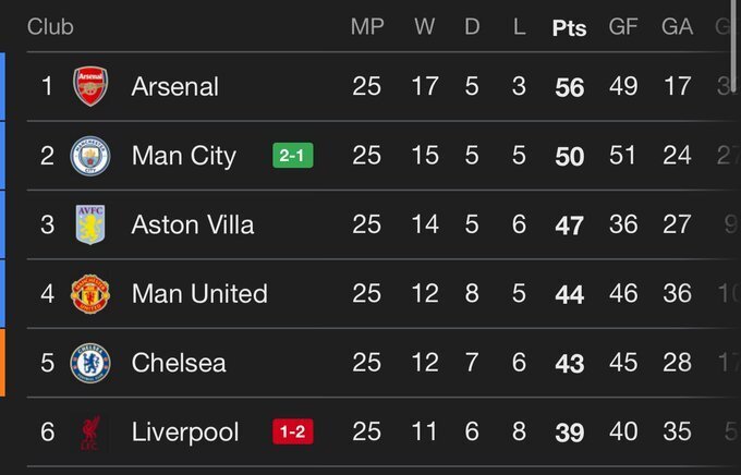 英超积分榜竞争激烈,阿森纳56分领跑,曼城50分紧随其后,阿斯顿维拉47分第3,曼联44分第4,切尔西43分第5。利物浦39分以进球数优势压布伦特福德(39分)排第6,埃弗顿35分第8、桑德兰34分第9紧追。